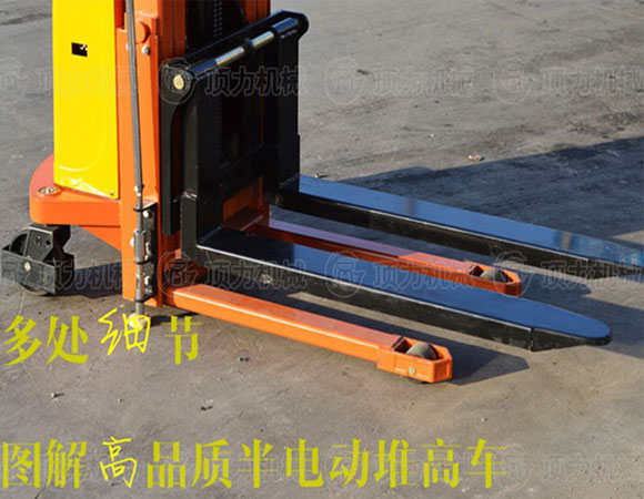 半電動堆高車就是采用的電動液壓升降、人力手推移動的簡易型電動堆高車;或者說是手動堆高車的升級版,升級了電動提升裝置,讓堆高的速度更快,工作效率更高。半自動堆高車的升高速度一般是0.1米/秒,比手動腳踩的那種人力堆高車的升高速度要快上不少。